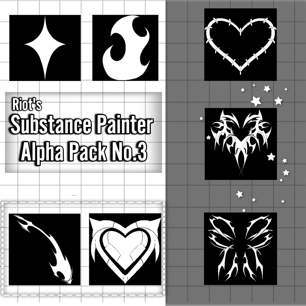 This pack includes Alphas for Substance Painter, such as;